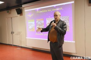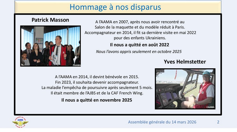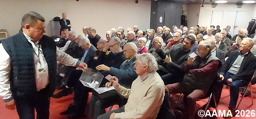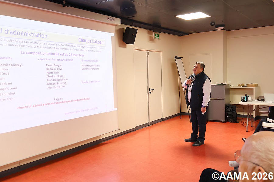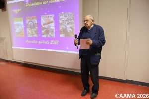 Avant de reprendre le cours de notre assemblée, notre vice-président Frédéric Buczko rend hommage à nos animateurs disparus, Patrick Masson et Yves Helmstetter, ainsi que Suzanne Vallin, fille de Louis Vallin, fondateur de l’AAMA, et détentrice de la carte AAMA numéro 1.