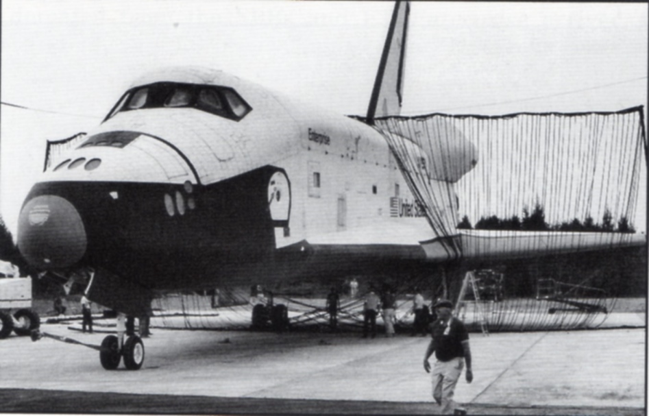 En 1987, Enterprise sort de son cocon pour quelques jours afin de tester une barrière d’arrêt susceptible d’être utilisée lors d’un atterrissage d’urgence dans le cas où le véhicule serait confronté à des systèmes de bord inopérants (aérofrein, freins, parachute de freinage).