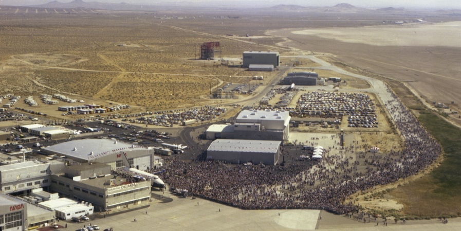 L’été suivant, la première navette est de sortie : le 4 juillet 1982 eu lieu des festivités peu habituelles au centre Dryden. En ce jour de fête nationale américaine (« Independance Day »), le président des USA de l’époque, Ronald Reagan, est venu assister à l’atterrissage de Columbia de retour de la mission STS-4, quatrième et dernier vol expérimental du programme STS, sur la piste 22 du Rogers Dry Lake d’Edwards AFB.