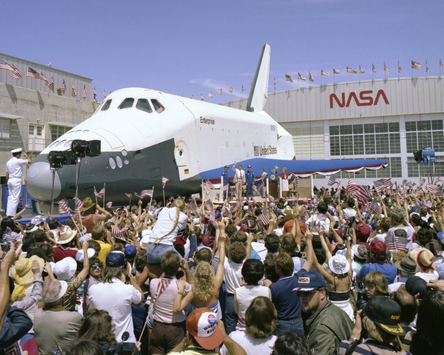 Après avoir salué Thomas Mattingly et Henry Hartsfield, respectivement commandant et pilote de l’OV-102, le président Reagan fit un discours au côté de l’orbiter Enterprise sorti pour l’occasion des bâtiments du centre Dryden et devant une foule de 45000 personnes enthousiastes.