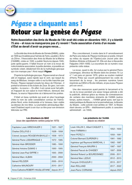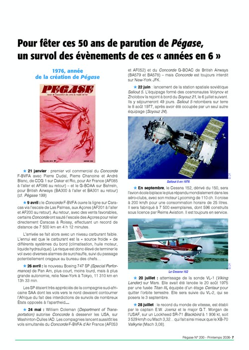 Après un retour sur la genèse de notre revue, le comité de rédaction fait un rappel des événements aéronautiques des années en 6, anniversaires de Pégase.