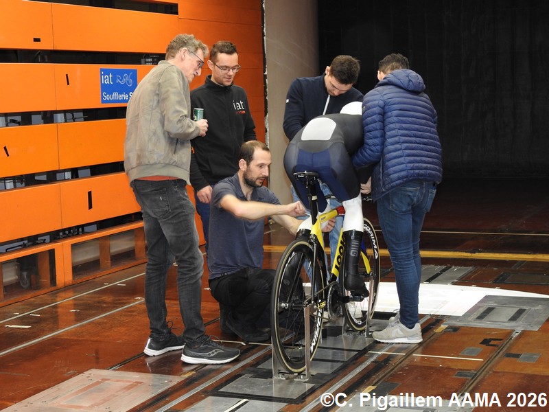 Lors de notre visite, nous avons eu la chance d’assister, mais sans déranger, à l’installation d’un essai en cours, avec un mannequin positionné sur un vélo, placé sur un plateau équipé d’une balance ultraprécise mesurant les efforts aérodynamiques dans les trois dimensions.