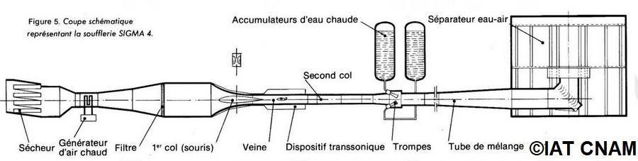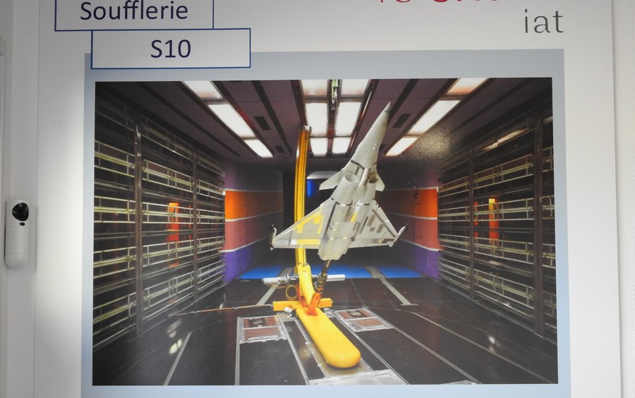 Nous passons ensuite à l’extérieur devant la soufflerie supersonique à rafales, la Sigma 4 construite au début des années soixante et à l’arrêt depuis 2006, non visitable pour des raisons de sécurité. Cette soufflerie, reconnaissable avec ses quatre accumulateurs d’eau, de grande taille, de conception moderne, certainement unique, mais complexe à mettre en œuvre et gourmande en énergie, a été utilisée pour tester les missiles Matra, Aérospatiale et MBDA. Les avions Dassault Mirage 2000 et Rafale y ont également fait leurs preuves, 80% des essais en soufflerie du Rafale ayant été réalisés à l’IAT.