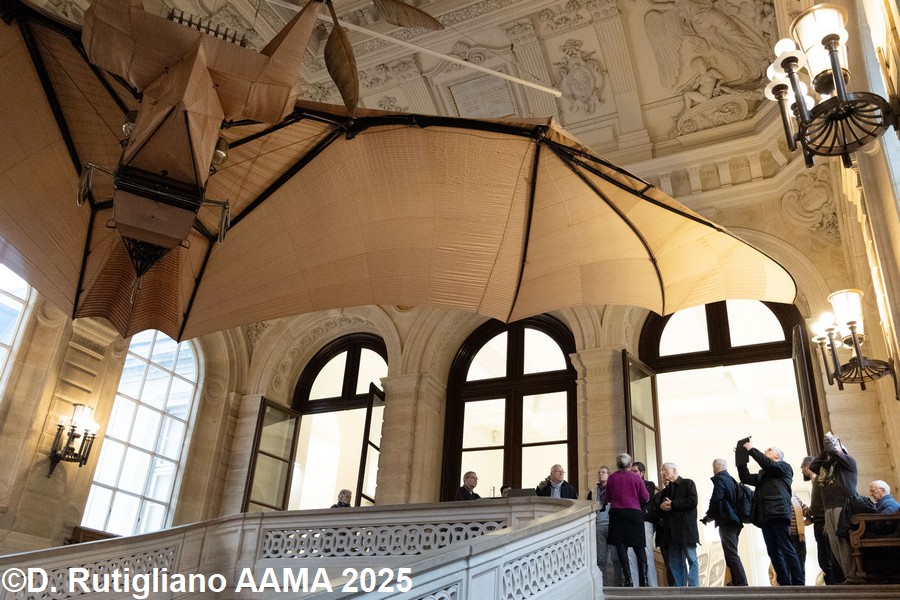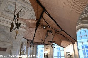 Notre visite passe ensuite par le grand escalier d’honneur du musée au-dessus duquel est accroché l’Avion n°3 de Clément Ader.