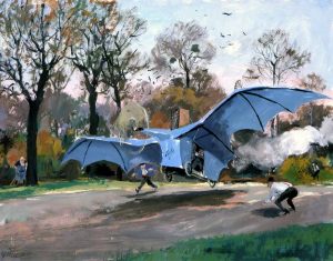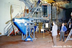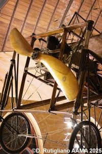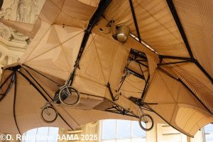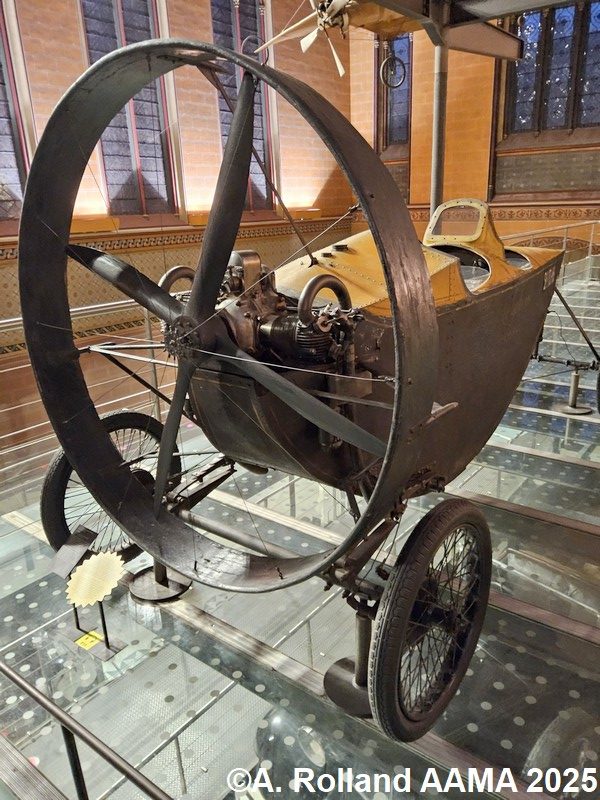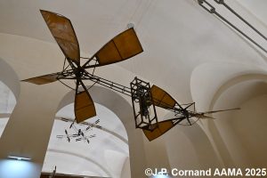 Toute proche, une maquette d’hélicoptère à quatre rotors rappelle certains drones légers actuels et aussi une maquette visible dans une vitrine du hall des Pionniers du Musée de l’Air. Il s’agit effectivement du même Gyroplane construit par Louis Breguet aidé de Charles Richet. La version grandeur nature réussit en 1907 à soulever son pilote deux fois à une hauteur de l’ordre d’un mètre. Le deuxième vol se termina par la destruction de l’engin. Louis Breguet, qui était d’abord convaincu de la meilleure efficacité des voilures tournantes, changea d’avis et s’orienta vers les voilures fixes. Un de ces premiers avions nous attend dans la prochaine étape.