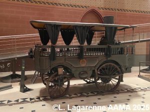 Au bas de l’escalier, notre groupe découvre ensuite le fardier de Cugnot, une des pièces majeures du musée.
