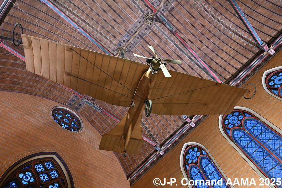 L’aéroplane REP1 suspendu au fond de l’église. Construit en 1906 par Robert Esnault-Pelterie, il est le premier aéroplane conçu par cet inventeur prolifique qui détient plus de cent brevets dont celui du manche à balai. D’abord testé comme planeur tracté, la machine très avancée pour l’époque (monoplan, structure métallique du fuselage) est ensuite équipée en 1907 d’un moteur conçu par Esnault-Pelterie. Il réalisera un vol de 100 m avec cet appareil dont il fera don au Conservatoire en 1920.