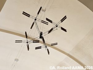 Suspendu au-dessus de nos têtes, l’hélicoptère des frères Armand et Henri Dufaux fut présenté en vol devant des membres de l’Aéro-Club de France en mai 1905. Il était doté d’un moteur à explosion très performant pour l’époque (3,1 ch pour un poids de 4,5 kg). Ce moteur était dit Motosacoche du nom de la marque de motocycles fondée par les frères Dufaux.